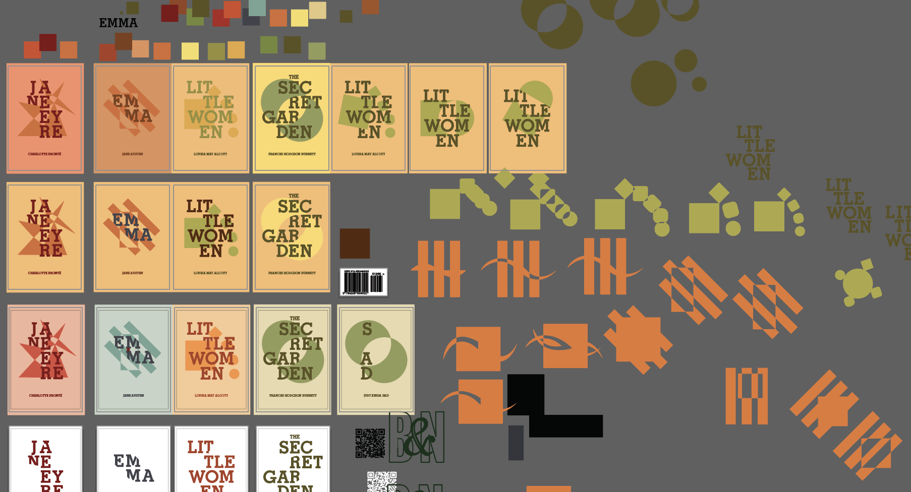As I began to brainstorm a visual strategy for the book covers, I took influence from two main places: Art Deco and Minimalism. I played around with the idea of illustrating the concepts of the books/campaign using only typography, and then I did the same thing but with non-objective shapes. The results intrigued me, and I continued forward with these ideas.